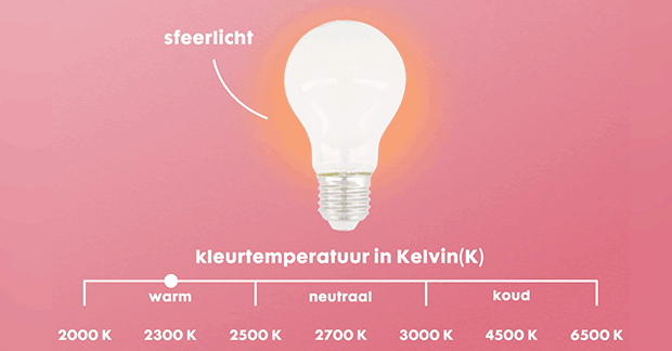Naast de felheid van het licht kun je kijken naar het aantal K wat de kleurtemperatuur van het licht in Kelvin aangeeft. De kleurtemperatuur ook wel lichtkleur geeft hoe of de lichtbron een warmer (geler) of kouder (witter) licht geeft. Tussen de 1000 en de 2500 K is een warm, zacht sfeerlicht. Tussen de 3000 en 4000 K geeft een neutraal licht en tussen de 5000 en 6000 K is vergelijkbaar met daglicht. De meest gekozen lichtbron voor in huis is rond de 3000 K.
